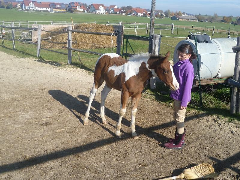 Sie ist ein sehr freundliches aufgewecktes selbstbewußtes Fohlen mit zwei zauberhaft blauen Augen. Ihr hübsches Köpfchen passt ausgesprochen gut zu ihrer gesamten Optik. (hat sie von ihrer Mam;) Schon jetzt zeigt sie, daß sie später mal kein sogenannter "Kleber" wird. Sie lässt Mami auf dem Reitplatz schaffen und sie bleibt solange bei den anderen Pferden und vergnügt sich.