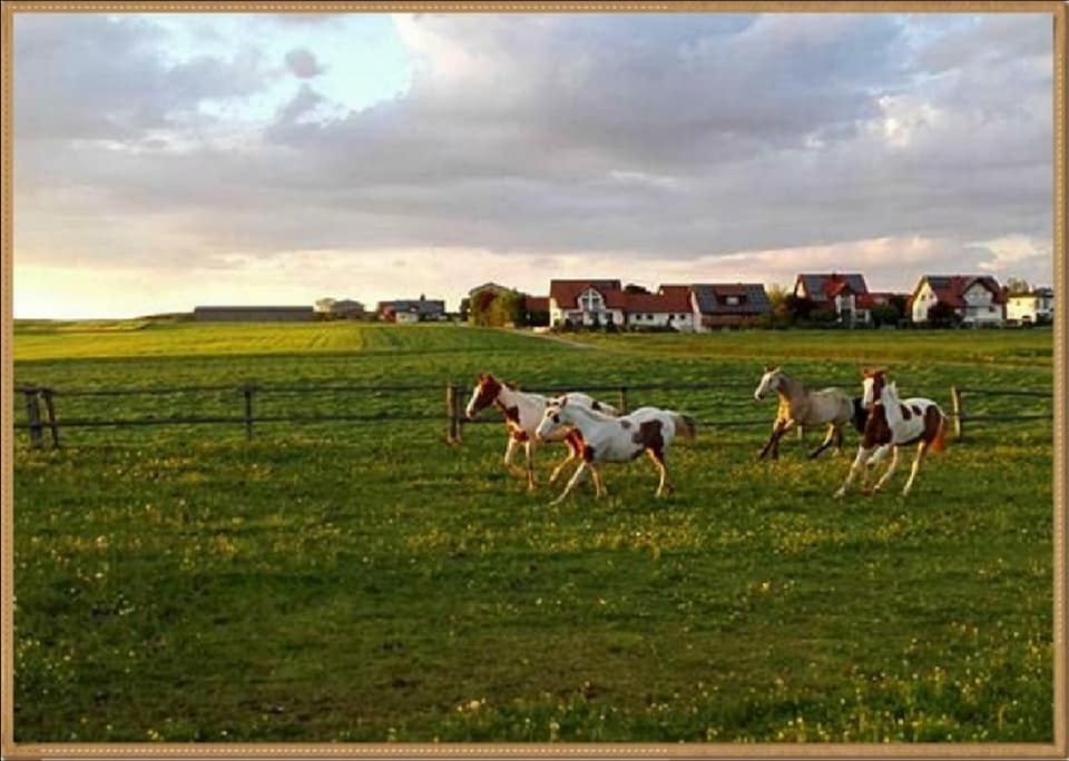 Inmitten deren liegen die Stallungen mit dem Sandauslauf. Von dort aus können die Pferde auf die verschieden Koppeln gehen.