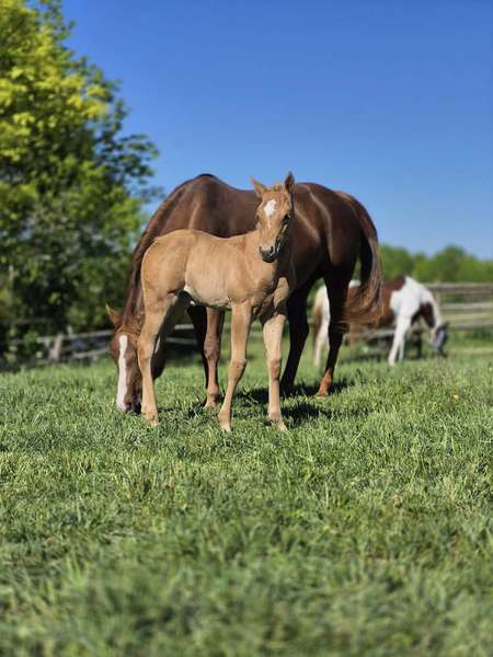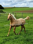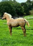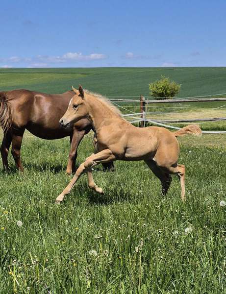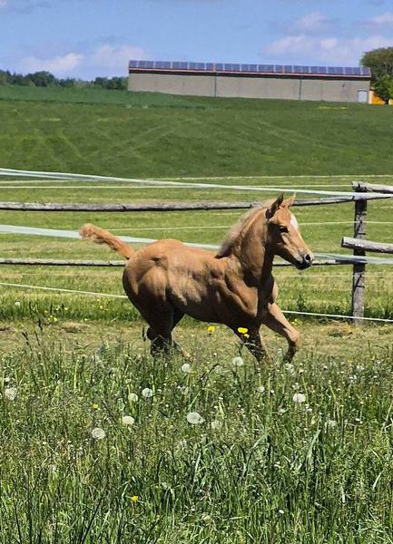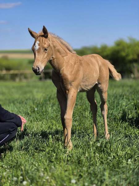 Unser Stutfohlen aus 04.25- ist in wundereschönem Palomino gezeichnet, hat ein gutes Fundament und jetzt schon einen muskulösen, korrekten Body.